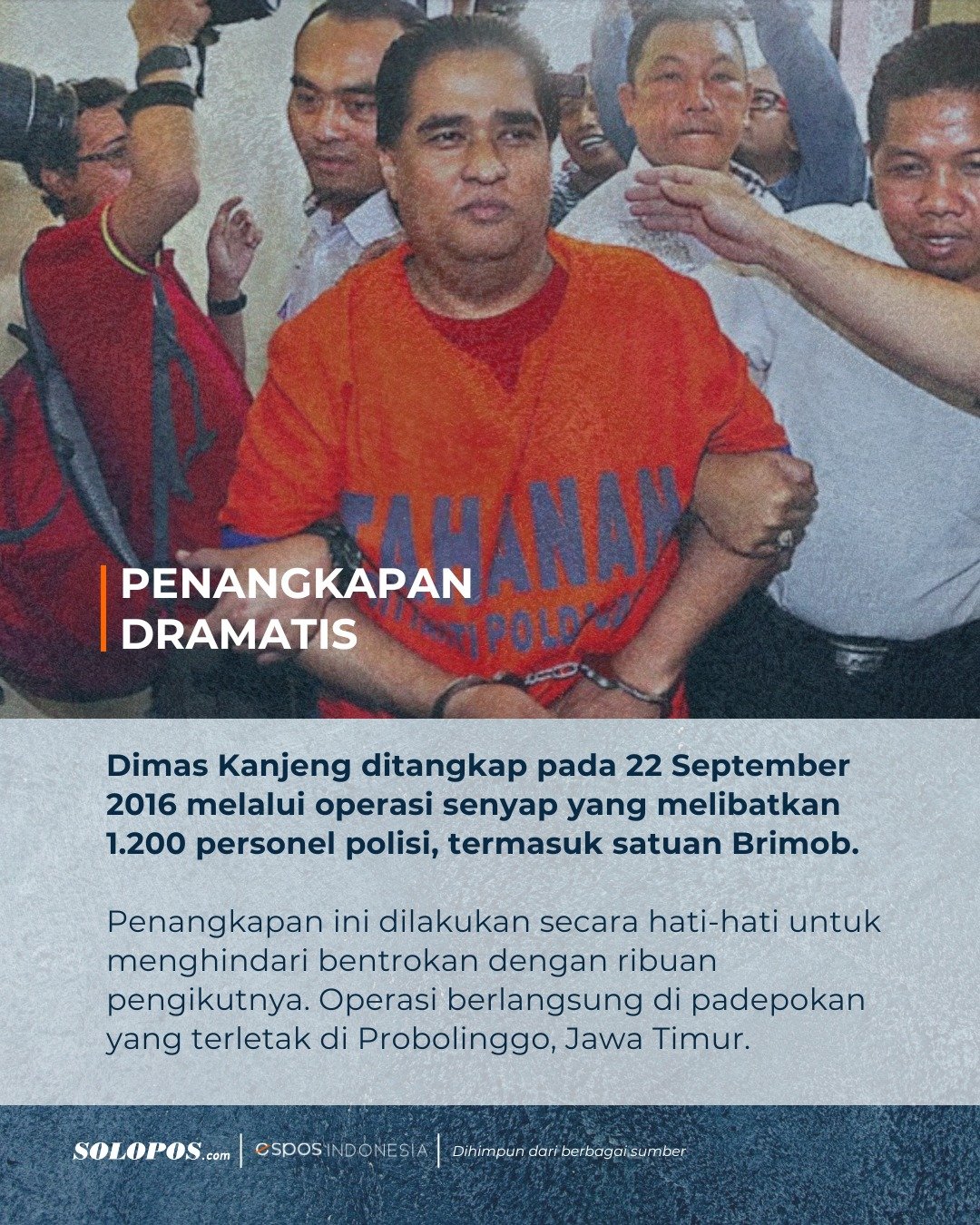 Dimas Kanjeng ditangkap pada 22 September 2016 atas kasus penipuan dukun pengganda uang yang berujung pembunuhan dua pengikutnya.