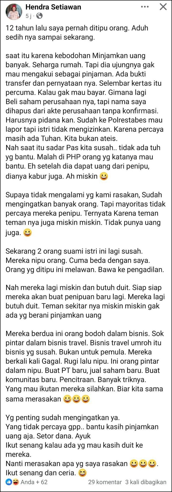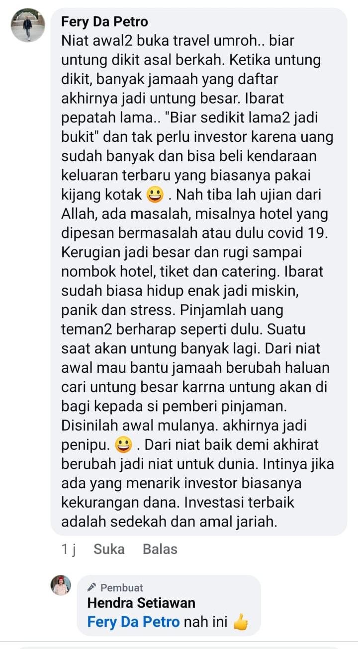 Mereka berdua ini orang bodoh dalam bisnis. Sok pintar dalam bisnis travel. Bisnis travel umroh itu bisnis yg susah. Bukan untuk pemula. Mereka berkali kali Gagal. Rugi lalu nipu. Ini orang pintar dalam nipu. Buat PT baru, jual saham baru. Buat komunitas baru. Pencitraan. Banyak triknya.