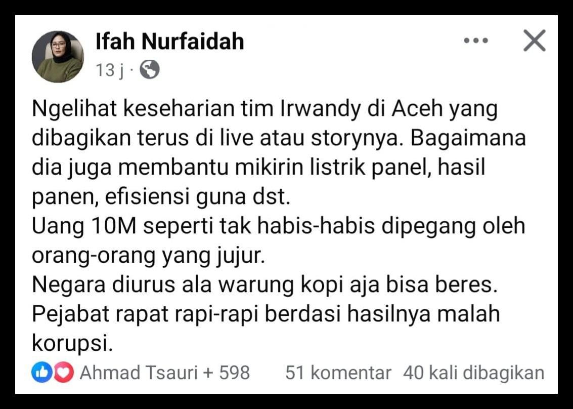 Ngelihat keseharian tim Ferry Irwandy di Aceh yang dibagikan terus di live atau storynya. Bagaimana dia juga membantu mikirin listrik panel, hasil panen, efisiensi guna dst.