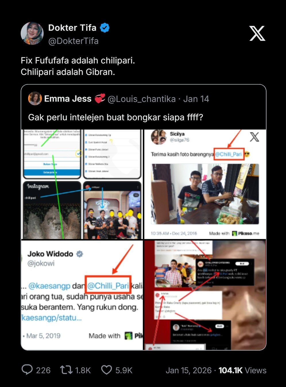 Dokter Tifa mengomentari jejak digital yang diunggah netizen di media sosial X terkait akun Kaskus Fufufafa yang punya kaitan dengan akun twitter (X) Chilipari. Akun twitter (X) Chilipari adalah akun milik Gibran Rakabuming Raka. Chilipari adalah nama bisnis katering milik Gibran.