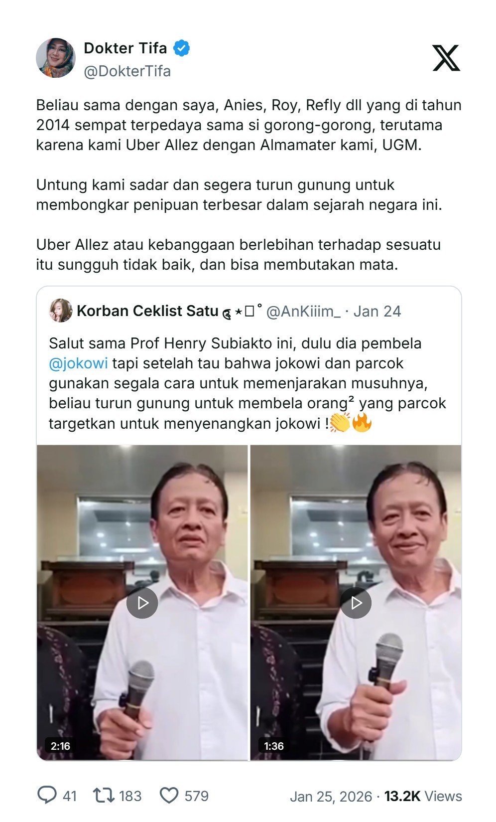 Awalnya Dokter Tifa menanggapi Prof. Henri Subiakto, Guru Besar Ilmu Komunikasi di Universitas Airlangga (UNAIR), yang dulu mendukung mati-matian Jokowi tapi sekarang sudah sadar dan membela trio RRT dalam kasus ijazah Jokowi.