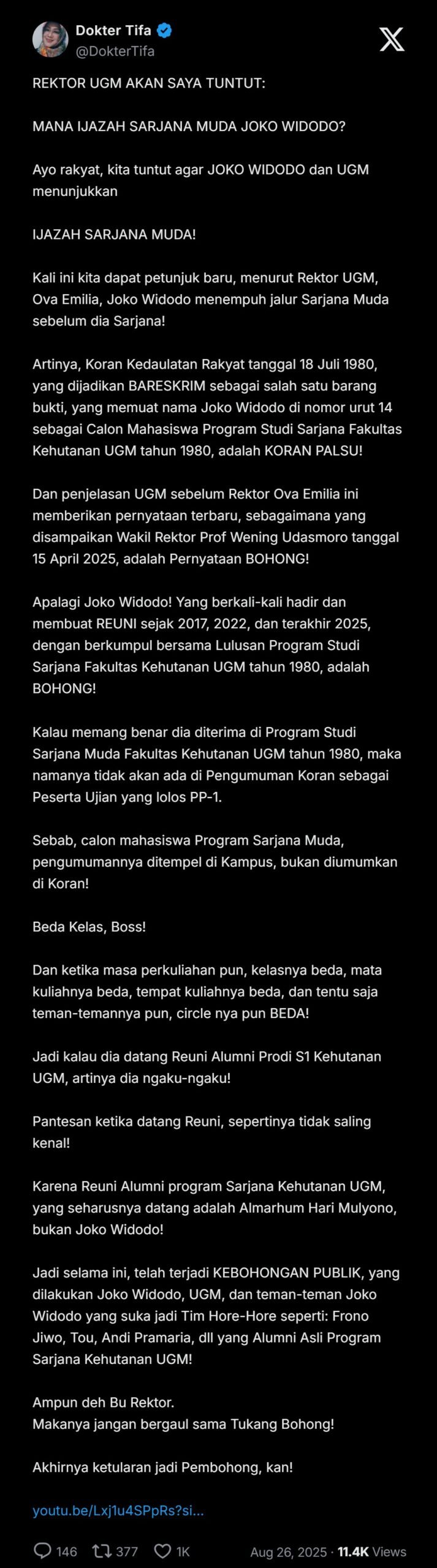 Dan penjelasan UGM sebelum Rektor Ova Emilia ini memberikan pernyataan terbaru, sebagaimana yang disampaikan Wakil Rektor Prof Wening Udasmoro tanggal 15 April 2025, adalah Pernyataan BOHONG!