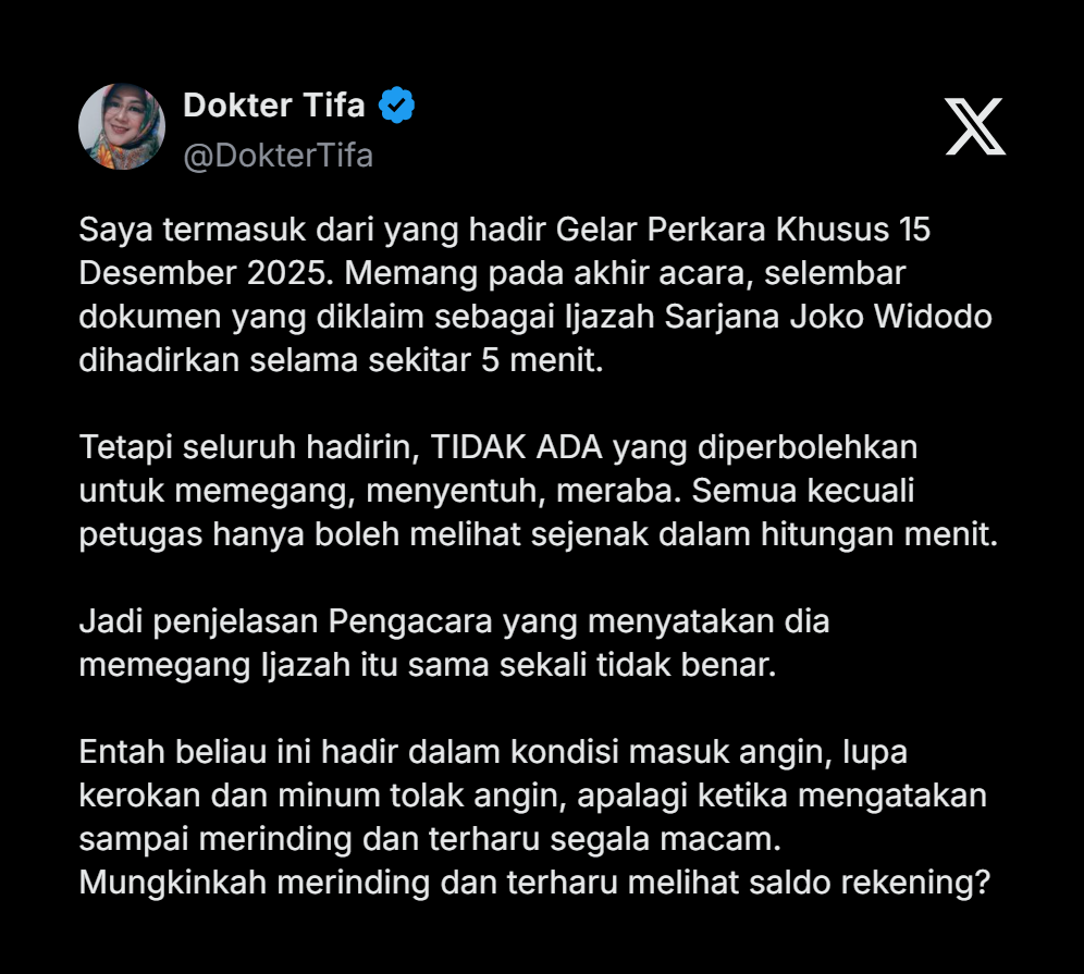 “Saya termasuk dari yang hadir Gelar Perkara Khusus 15 Desember 2025. Memang pada akhir acara, selembar dokumen yang diklaim sebagai Ijazah Sarjana Joko Widodo dihadirkan selama sekitar 5 menit.