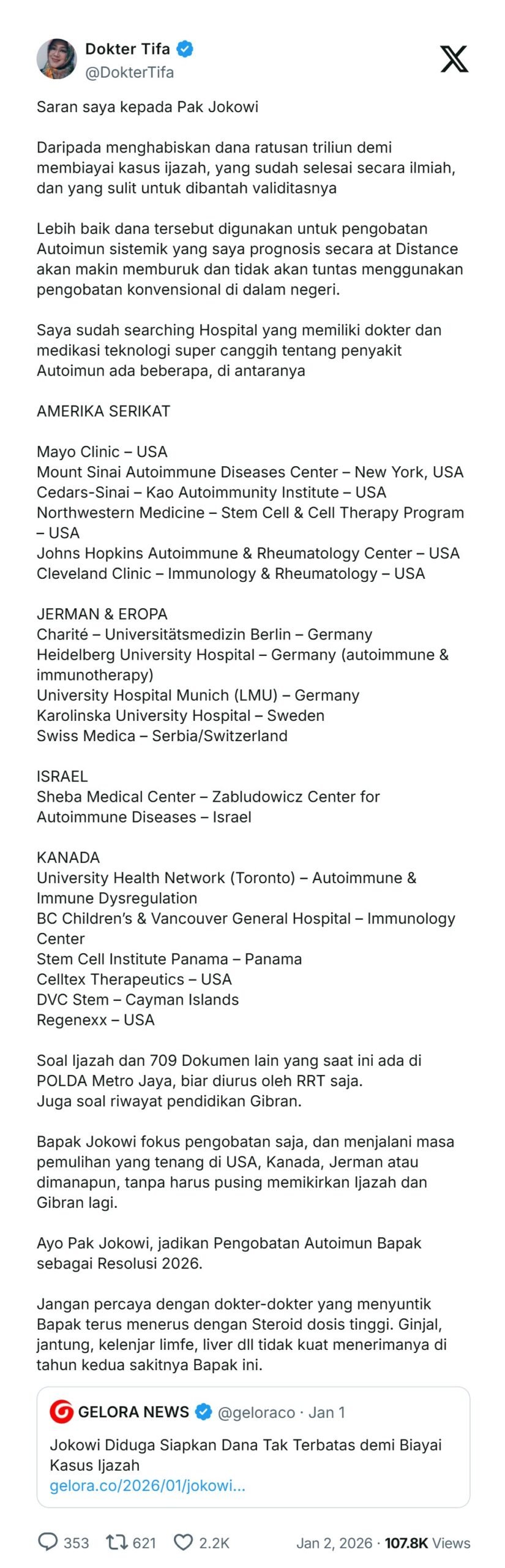 Lebih baik dana tersebut digunakan untuk pengobatan Autoimun sistemik yang saya prognosis secara at Distance akan makin memburuk dan tidak akan tuntas menggunakan pengobatan konvensional di dalam negeri,” tulis Dokter Tifa.
