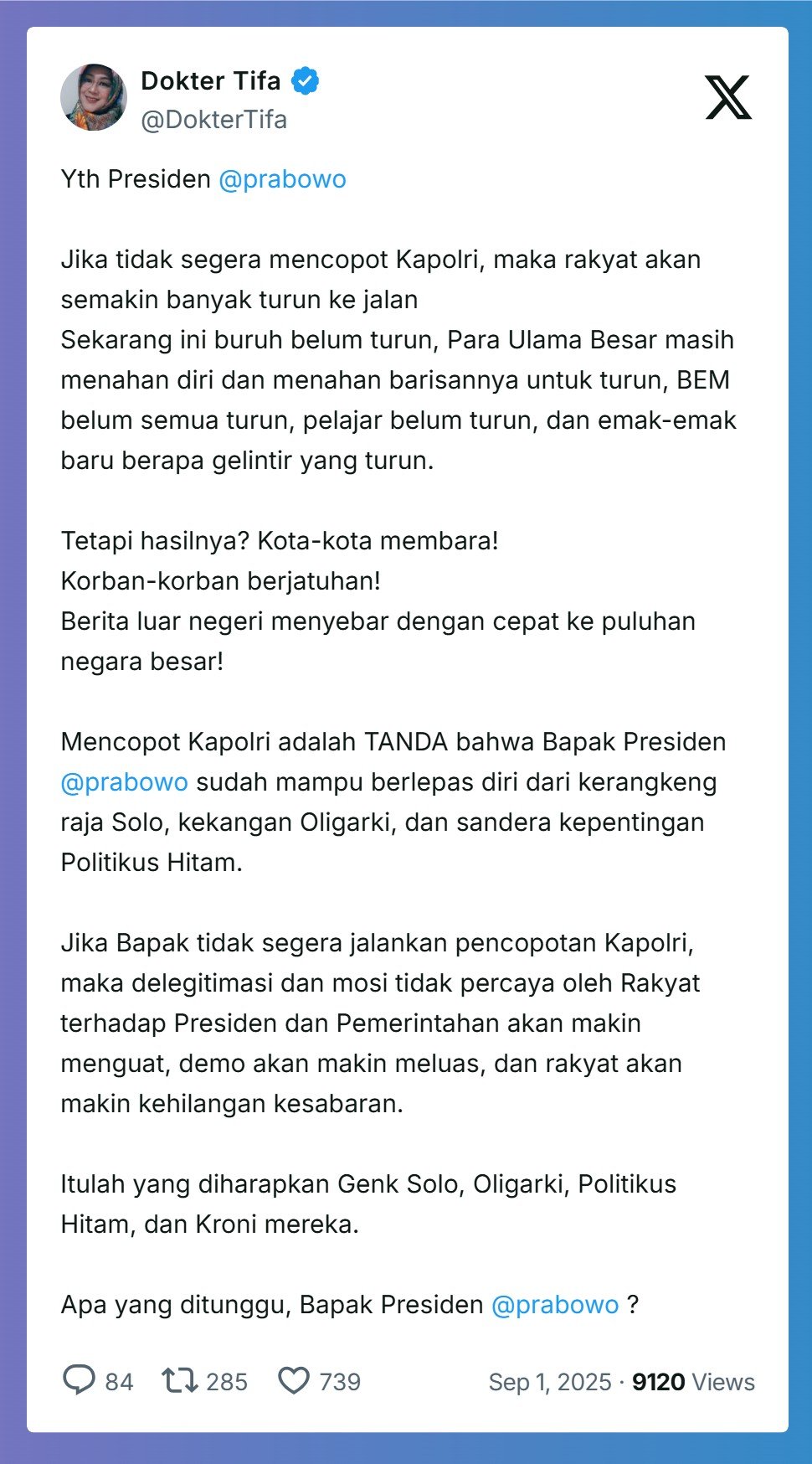 Mencopot Kapolri adalah TANDA bahwa Bapak Presiden @prabowo sudah mampu berlepas diri dari kerangkeng raja Solo, kekangan Oligarki, dan sandera kepentingan Politikus Hitam.
