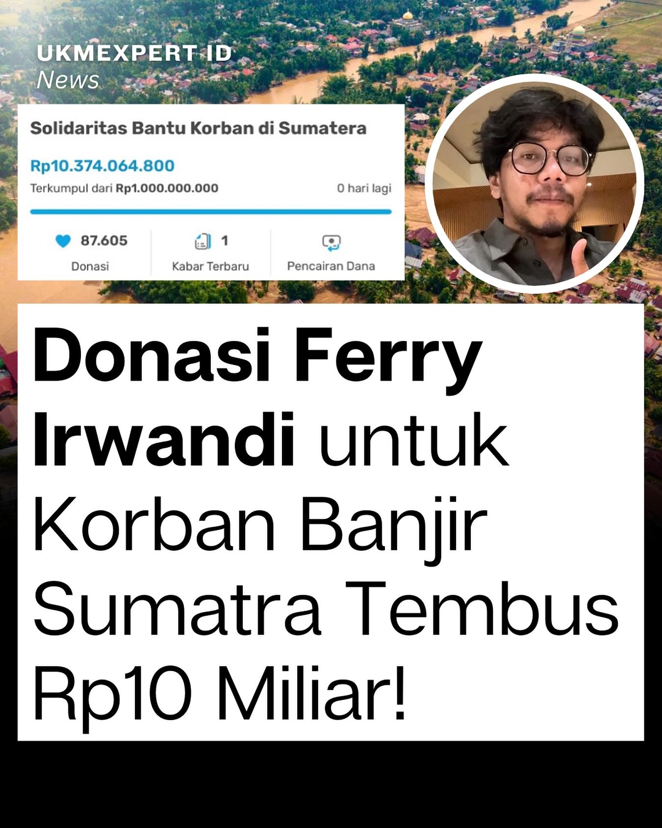 Kampanye penggalangan dana yang digagas oleh aktivis dan influencer Ferry Irwandi di platform KitaBisa berhasil mengumpulkan Rp10 miliar hanya dalam 24 jam untuk membantu korban bencana di Sumatra.