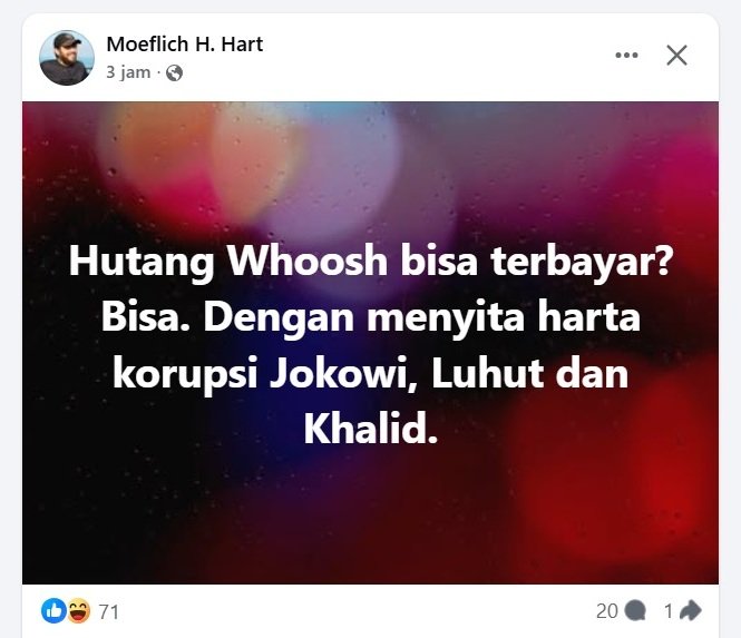 “Hutang Whoosh bisa terbayar? Bisa. Dengan menyita harta korupsi Jokowi, Luhut dan Riza Khalid (bos minyak yang buron)”