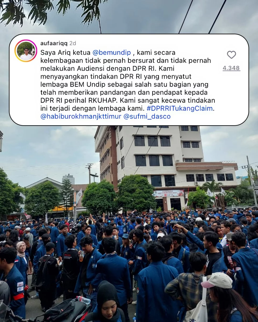 Penolakan juga datang dari BEM Universitas Diponegoro, yang menyatakan bahwa mereka tidak pernah menghadiri audiensi atau memberi masukan kepada DPR mengenai pembahasan RKUHAP. Mereka justru menilai DPR sedang membangun ilusi seolah terdapat dukungan dari kampus dan masyarakat sipil untuk mempercepat pengesahan RKUHAP.