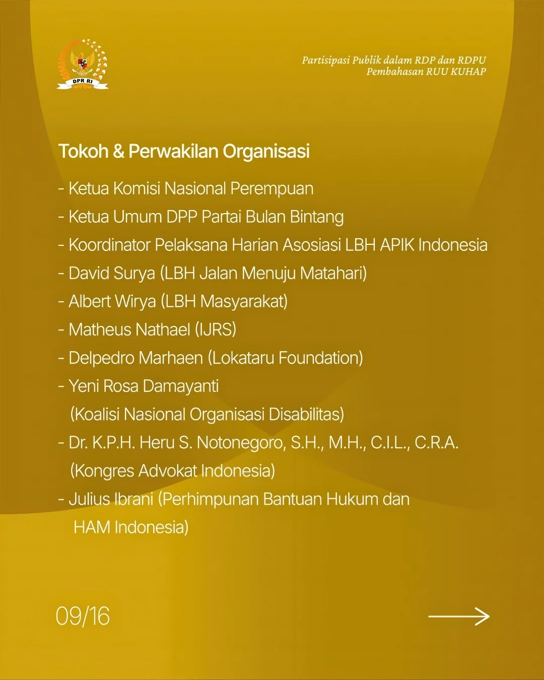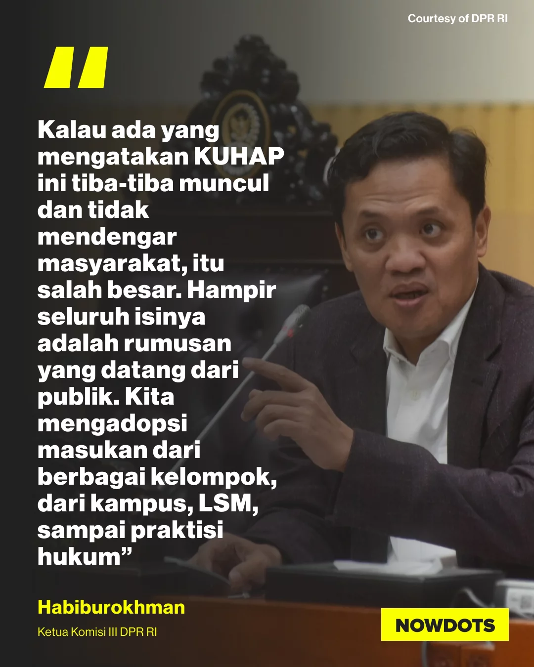 Direktur Eksekutif Lokataru Foundation, Delpedro Marhaen, menegaskan bahwa DPR telah mencatut namanya dalam unggahan resmi yang mengklaim ia ikut mendukung penyusunan Rancangan Undang-Undang Hukum Acara Pidana (RKUHAP). Dalam surat resmi bertanggal 18 November 2025, Delpedro menolak keras klaim tersebut dan menegaskan bahwa ia tidak pernah terlibat, menghadiri undangan, ataupun memberikan legitimasi atas proses penyusunan RKUHAP yang menurutnya bermasalah sejak awal. Ia menyebut proses legislasi RKUHAP minim partisipasi publik dan sarat upaya mereduksi kontrol masyarakat terhadap kewenangan aparat penegak hukum.