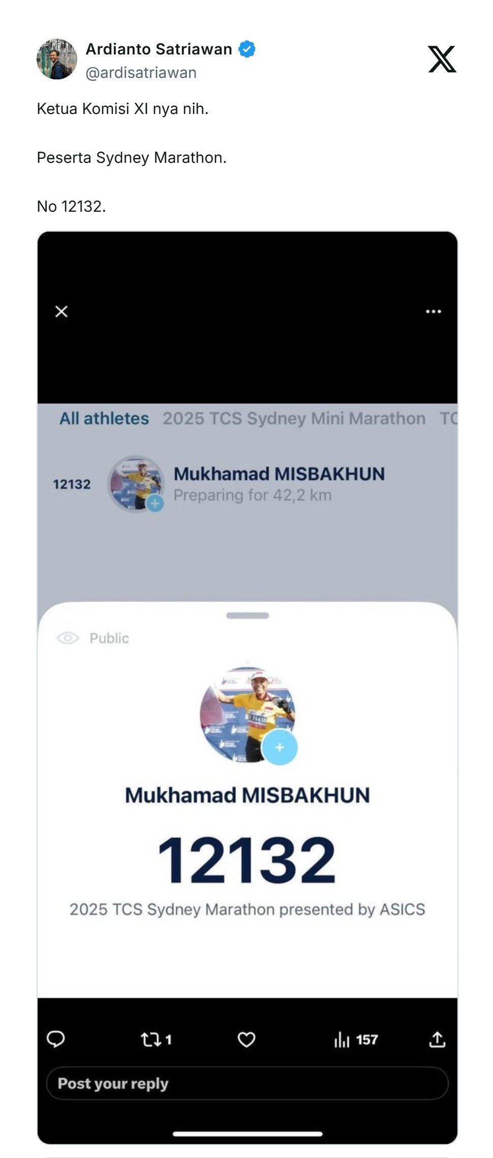 Nama Mukhamad Misbakhun diketahui tercatat sebagai salah satu peserta TCS Sydney Marathon 2025.