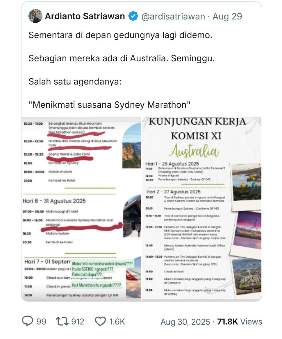 Sebelumnya, muncul juga selebaran terkait itinerary kunjungan kerja Komisi XI ke Australia pada periode 26 Agustus-1 September 2025.