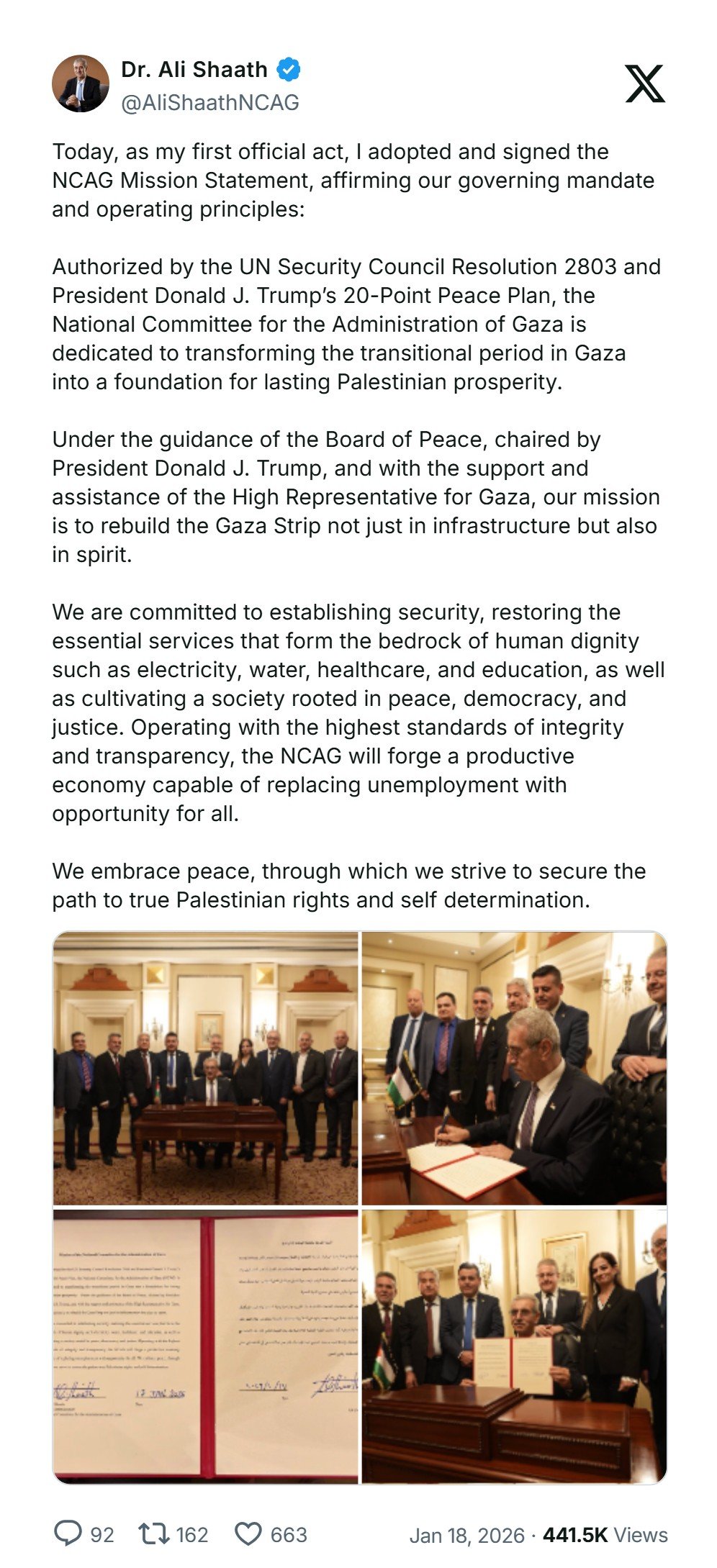 Dr. Ali Shaath Kepala Komite Nasional Palestina untuk Pengelolaan Gaza (National Committee for the Administration of Gaza/NCAG), secara resmi telah memulai tugasnya. Tindakan pertamanya dalam jabatan adalah menandatangani Pernyataan Misi NCAG, yang mendefinisikan prinsip-prinsip untuk rekonstruksi dan tata kelola Jalur Gaza selama periode transisi.