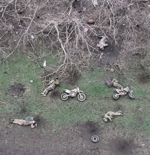 *Ket. foto: anggota kavaleri bermotor Rusia yang tewas bergelimpangan dihabisi drone di sebuah hutan dekat Donets.