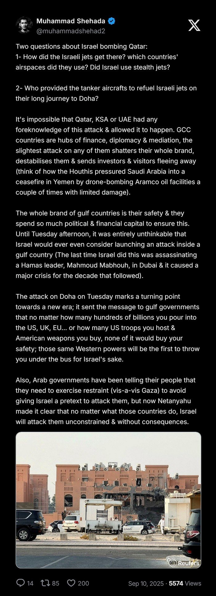 Serangan terhadap Doha pada hari Selasa menandai titik balik menuju era baru; serangan ini mengirimkan pesan kepada pemerintah-pemerintah Teluk bahwa tidak peduli berapa ratus miliar dolar yang Anda kucurkan ke AS, Inggris, Uni Eropa… atau berapa banyak pasukan AS yang Anda tampung & senjata Amerika yang Anda beli, semua itu tidak akan dapat membeli keselamatan Anda; kekuatan-kekuatan Barat yang sama itu akan menjadi pihak pertama yang mencelakai Anda demi Israel.