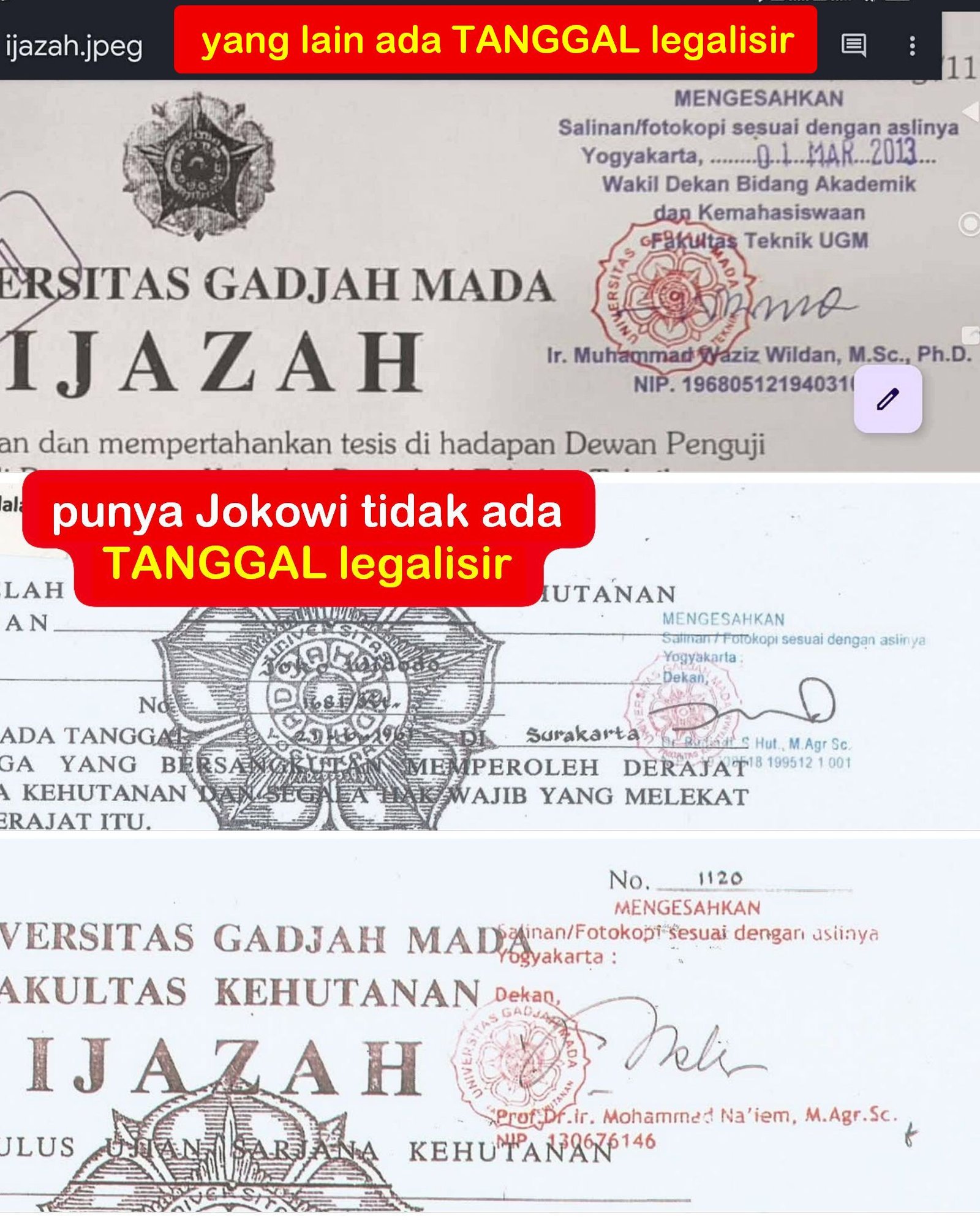 Namun, pemandangan kontras terlihat pada salinan legalisir ijazah Fakultas Kehutanan atas nama Joko Widodo. Dalam dua versi dokumen yang berbeda (dengan dua Dekan yang berbeda), stempel legalisir tersebut tidak memiliki keterangan waktu. Hanya ada tanda tangan dan stempel institusi, tanpa tempus.