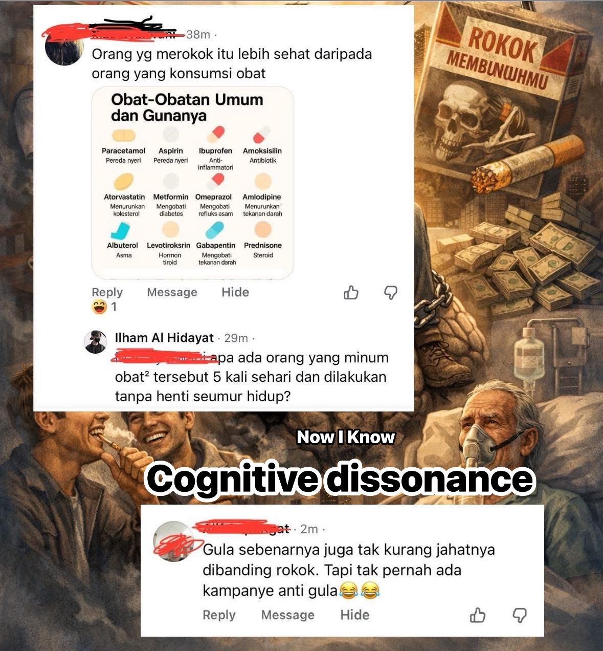 Memang saya merokok, tapi lihat tuh… ada yang minum obat seumur hidup, ada gula yang sebenarnya lebih bahaya, nenek gw perokok tapi umurnya panjang. Bla, bla, bla…