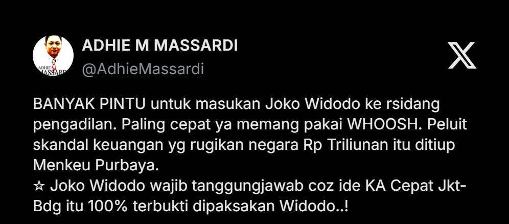 “BANYAK PINTU untuk masukan Joko Widodo ke sidang pengadilan. Paling cepat ya memang pakai WHOOSH,” kata @AdhieMassardi.