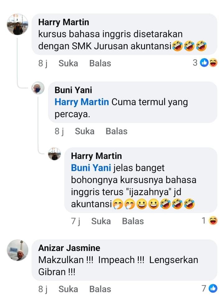 “Yang mengeluarkan surat penyetaraan ini tidak paham bahwa UTS Insearch di Sydney tidak bisa disetarakan dengan SMK karena UTS Insearch cuma kursus persiapan kuliah. Kesimpulan: pemilik surat keterangan ini cuma tamat SMP. Makzulkan!” ujar Buni Yani.