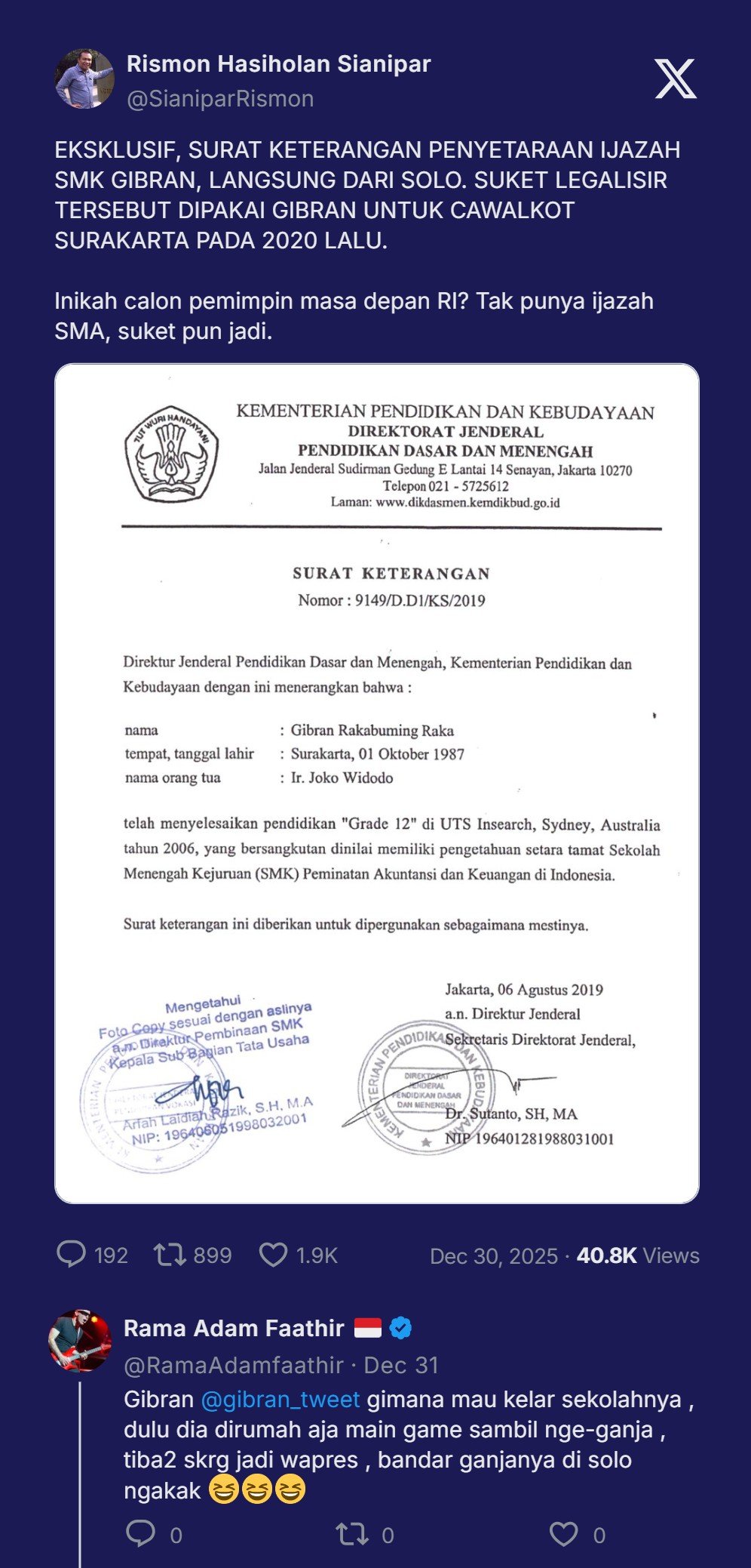 “EKSKLUSIF, SURAT KETERANGAN PENYETARAAN IJAZAH SMK GIBRAN, LANGSUNG DARI SOLO. SUKET LEGALISIR TERSEBUT DIPAKAI GIBRAN UNTUK CAWALKOT SURAKARTA PADA 2020 LALU. Inikah calon pemimpin masa depan RI? Tak punya ijazah SMA, suket pun jadi,” ujar Rismon Hasiholan Sianipar di akun X @SianiparRismon, Selasa (30/12/2025).