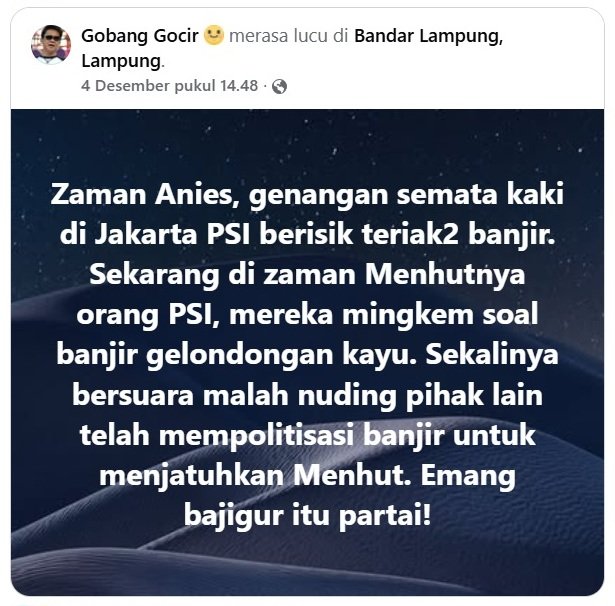 Zaman Anies, genangan semata kaki di Jakarta PSI berisik teriak-teriak banjir. Sekarang di zaman Menhutnya orang PSI, mereka mingkem soal banjir gelondongan kayu. Sekalinya bersuara malah nuding pihak lain telah mempolitisasi banjir untuk menjatuhkan Menhut.
