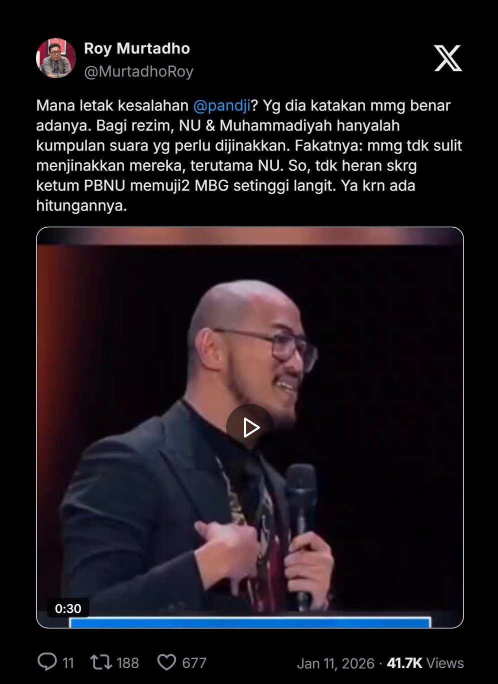 Mana letak kesalahan @pandji ? Yang dia katakan memang benar adanya. Bagi rezim, NU & Muhammadiyah hanyalah kumpulan suara yang perlu dijinakkan.