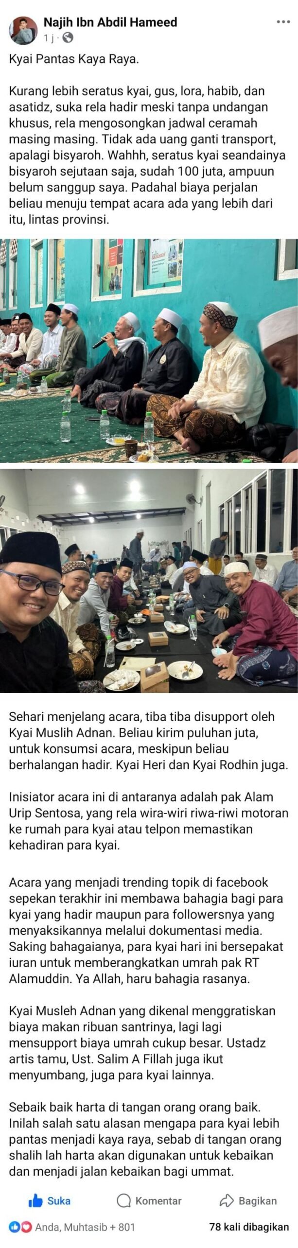 Acara yang menjadi trending topik di facebook sepekan terakhir ini membawa bahagia bagi para kyai yang hadir maupun para followersnya yang menyaksikannya melalui dokumentasi media. Saking bahagaianya, para kyai hari ini bersepakat iuran untuk memberangkatkan umrah pak RT Alamuddin. Ya Allah, haru bahagia rasanya.