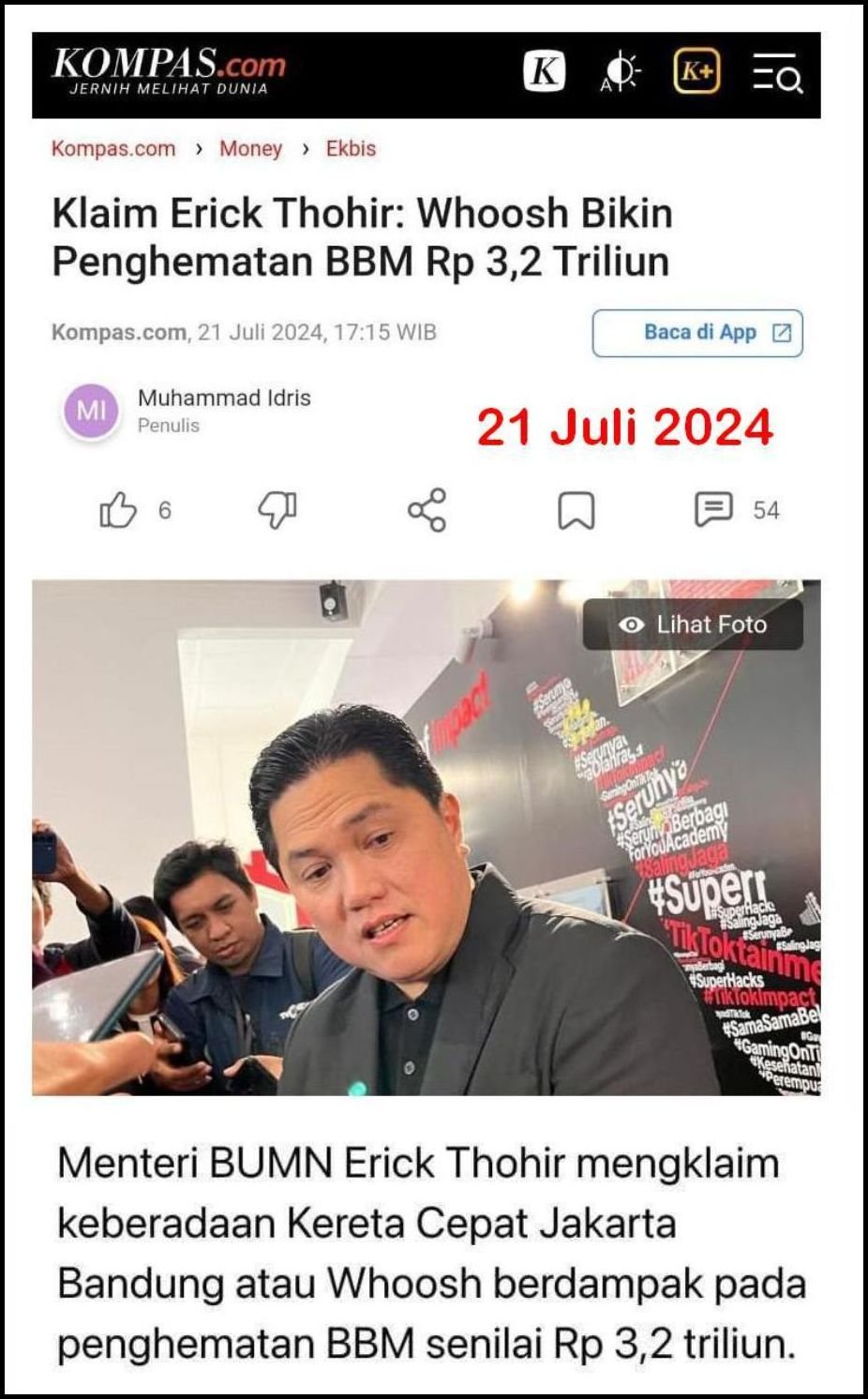 - Waktu itu, Menteri BUMN Erick Thohir rajin tampil di media sambil mengklaim bahwa Whoosh! telah menghemat BBM Rp3,2 triliun dan menyumbang PDRB (Produk Domestik Regional Bruto) Rp86,5 triliun, dan seterusnya.