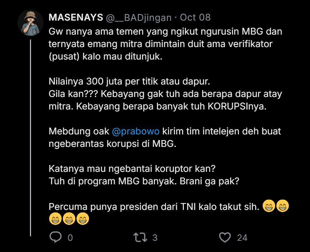 Mebdung oak @prabowo kirim tim intelejen deh buat ngeberantas korupsi di MBG.