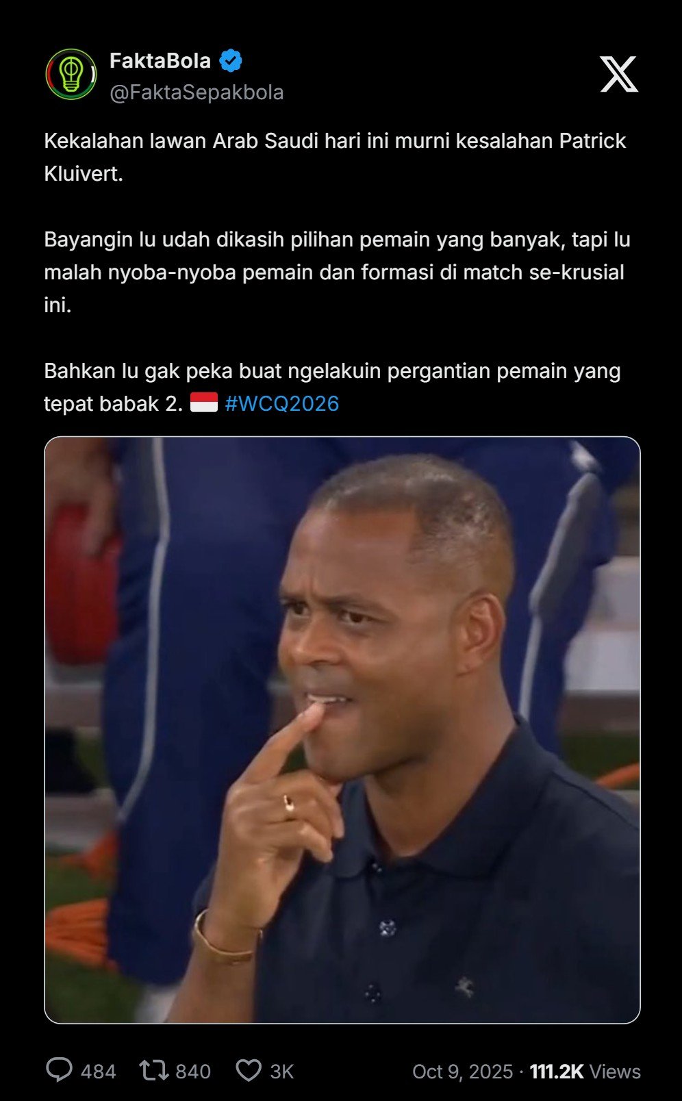 “Kekalahan lawan Arab Saudi hari ini murni kesalahan Patrick Kluivert. Bayangin lu udah dikasih pilihan pemain yang banyak, tapi lu malah nyoba-nyoba pemain dan formasi di match se-krusial ini. Bahkan lu gak peka buat ngelakuin pergantian pemain yang tepat babak 2,” cuit akun FaktaBola @FaktaSepakbola di X.