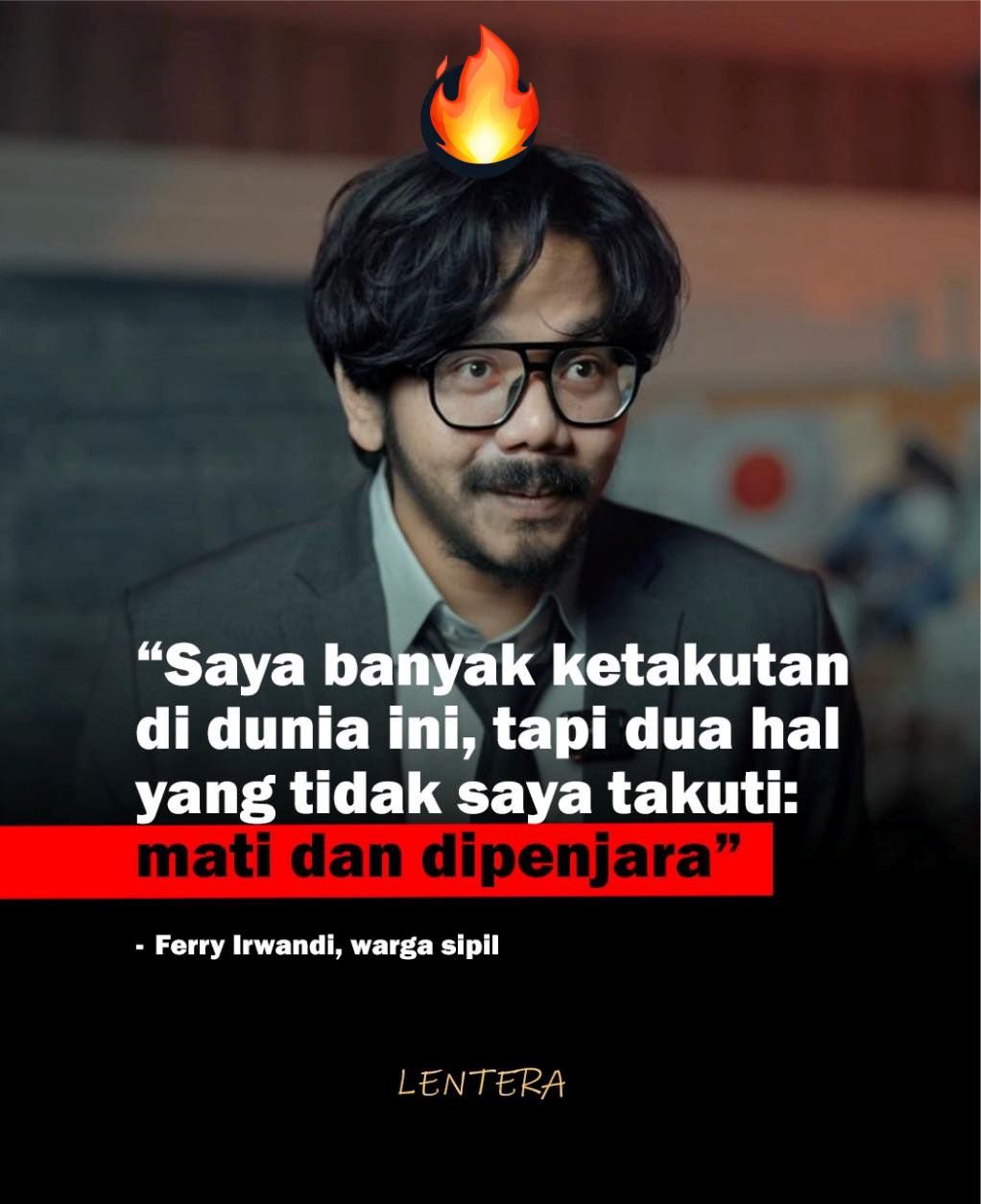 “Saya banyak ketakutan di dunia ini, tapi dua hal yang tidak saya takuti: mati dan dipenjara,” tanda Ferry Irwandi.