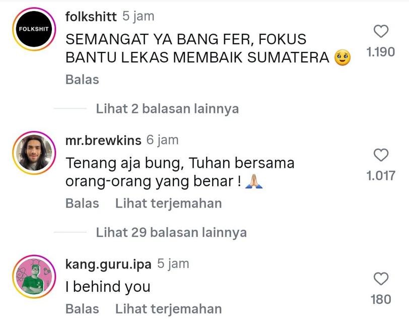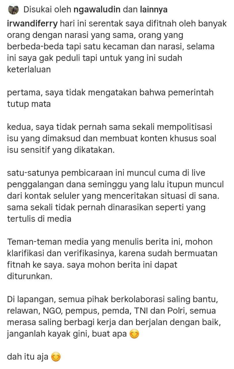 Berikut pernyataan Ferry Irwandi di akun Instagramnya (8/12/2025):
