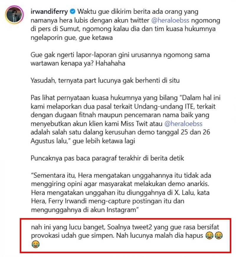 “Sementara itu, Hera mengatakan unggahannya itu tidak ada menggiring opini agar masyarakat melakukan demo anarkis. Hera mengatakan unggahan itu diunggahnya di X. Lalu, kata Hera, Ferry Irwandi meng-capture postingan itu dan mengunggahnya di akun Instagram”
