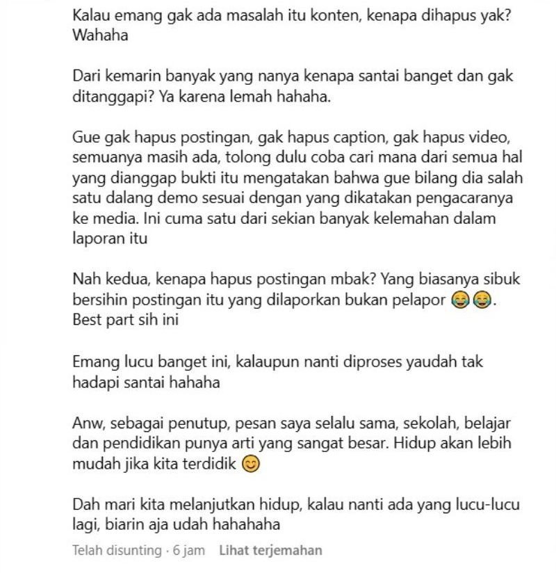 Gue gak hapus postingan, gak hapus caption, gak hapus video, semuanya masih ada, tolong dulu coba cari mana dari semua hal yang dianggap bukti itu mengatakan bahwa gue bilang dia salah satu dalang demo sesuai dengan yang dikatakan pengacaranya ke media. Ini cuma satu dari sekian banyak kelemahan dalam laporan itu