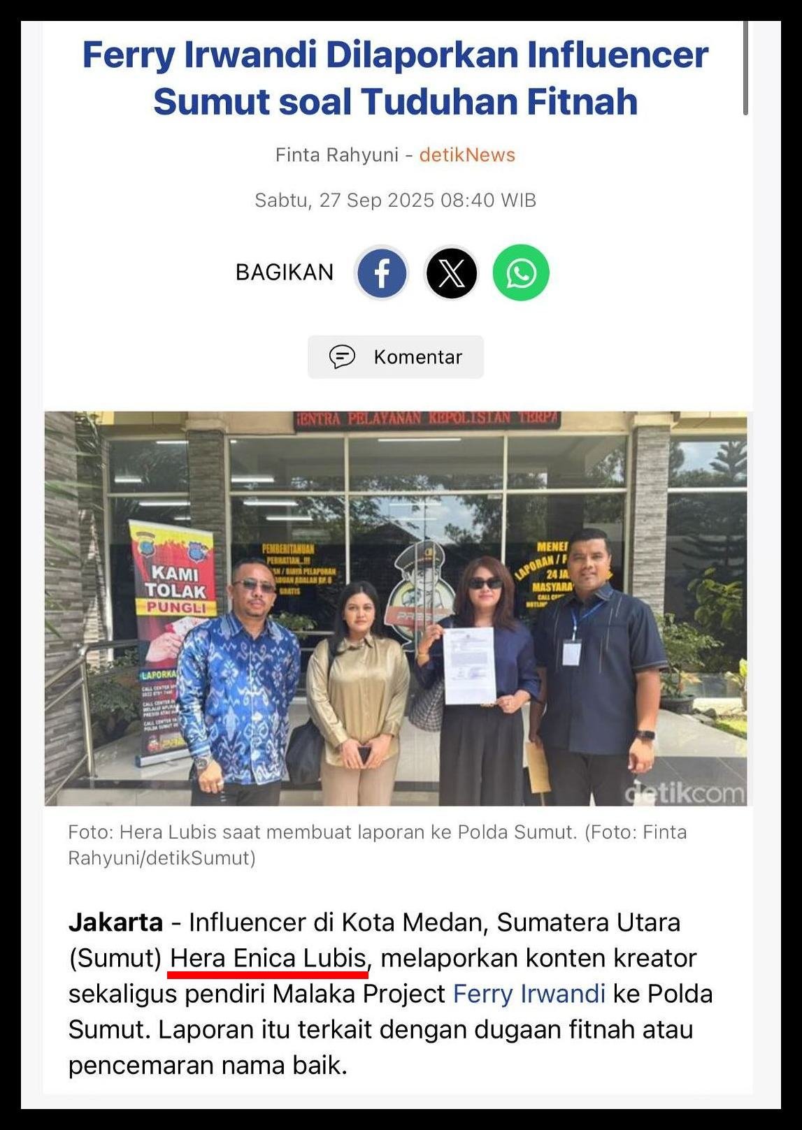 “Sementara itu, Hera mengatakan unggahannya itu tidak ada menggiring opini agar masyarakat melakukan demo anarkis. Hera mengatakan unggahan itu diunggahnya di X. Lalu, kata Hera, Ferry Irwandi meng-capture postingan itu dan mengunggahnya di akun Instagram”