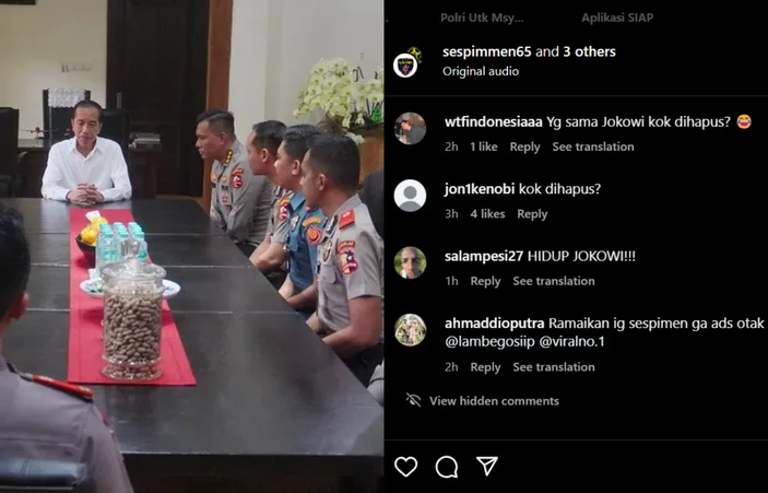 Namun, hanya berselang sehari dari unggahan, foto Jokowi kini hilang dari akun Instagram resmi Sespimmen 65.