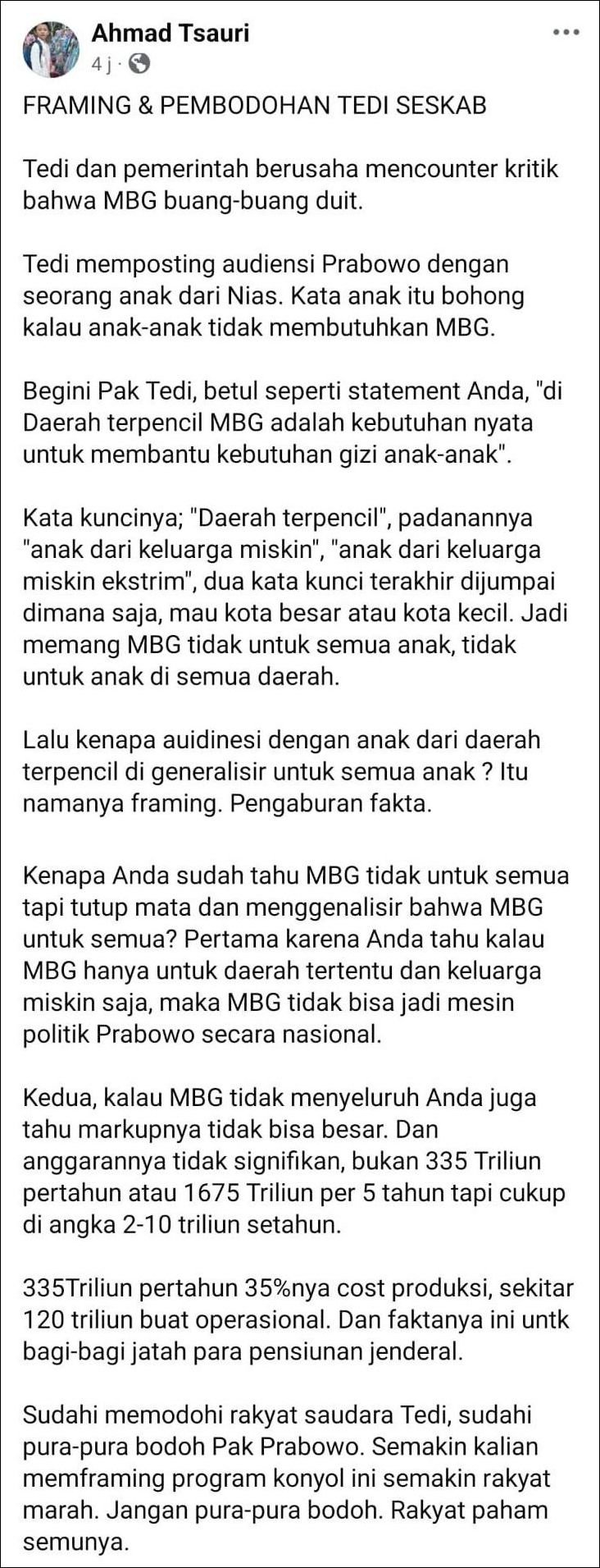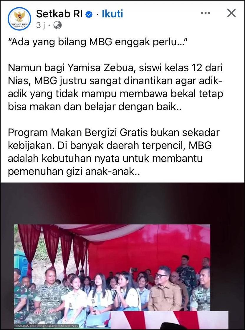 Tedi memposting audiensi Prabowo dengan seorang anak dari Nias. Kata anak itu bohong kalau anak-anak tidak membutuhkan MBG.