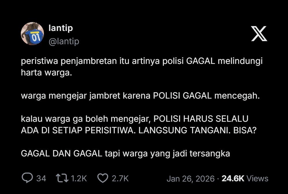 Peristiwa penjambretan itu artinya polisi GAGAL melindungi harta warga.