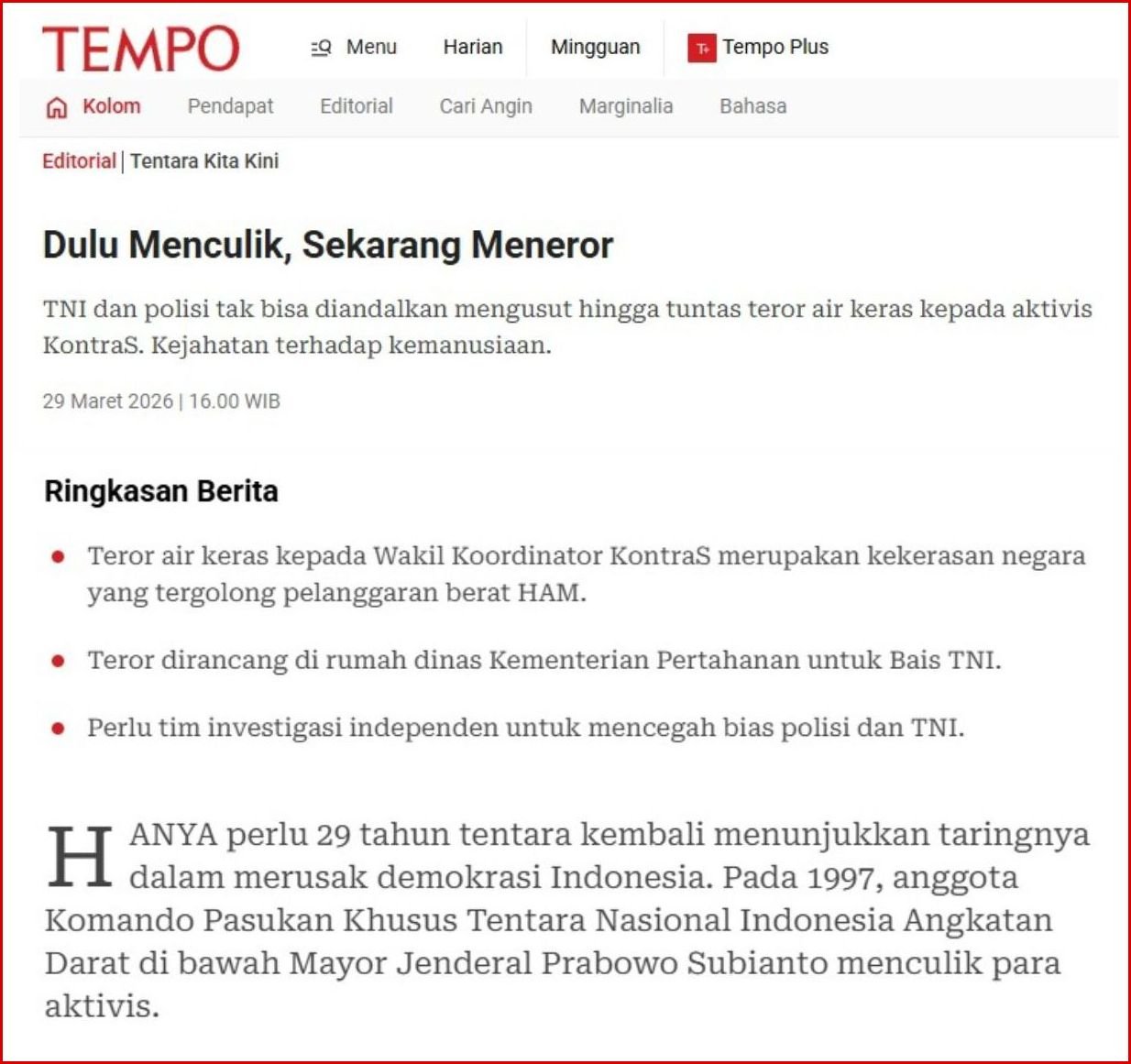 HANYA perlu 29 tahun tentara kembali menunjukkan taringnya dalam merusak demokrasi Indonesia. Pada 1997, anggota Komando Pasukan Khusus Tentara Nasional Indonesia Angkatan Darat di bawah Mayor Jenderal Prabowo Subianto menculik para aktivis.