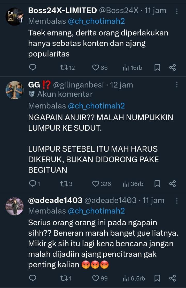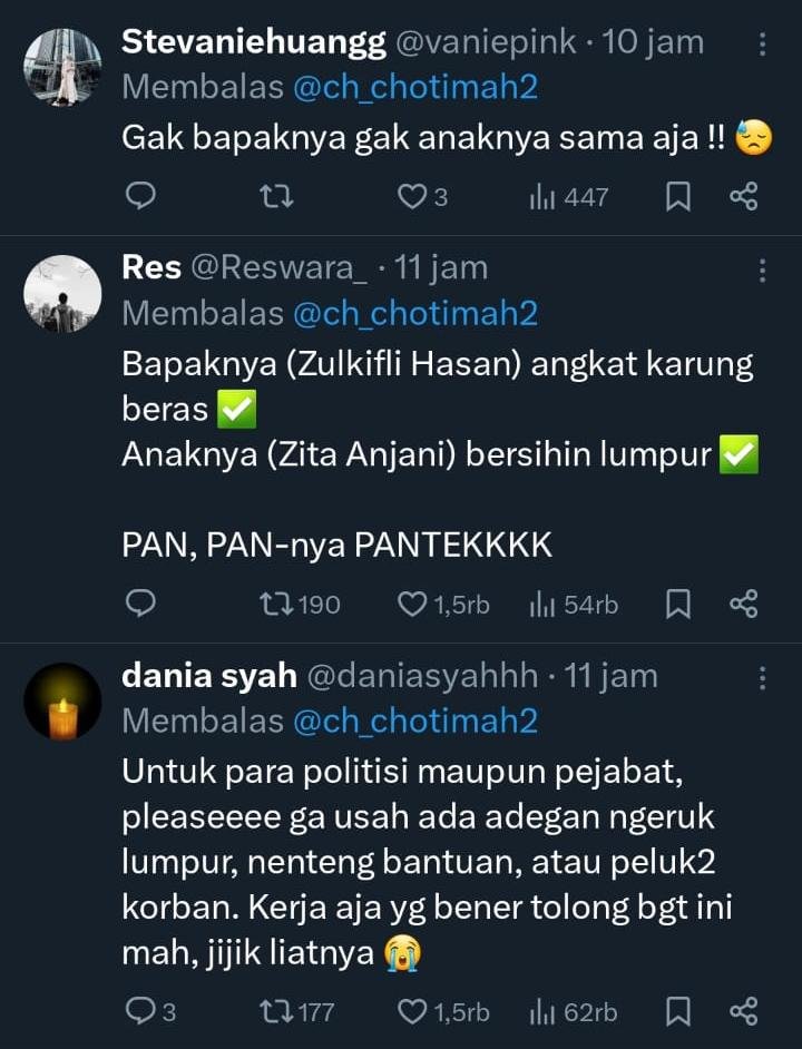 “Untuk para politisi maupun pejabat, pleaseeee ga usah ada adegan ngeruk lumpur, nenteng bantuan, atau peluk2 korban. Kerja aja yg bener tolong bgt ini mah, jijik liatnya π,” ujar akun X @daniasyahhh.