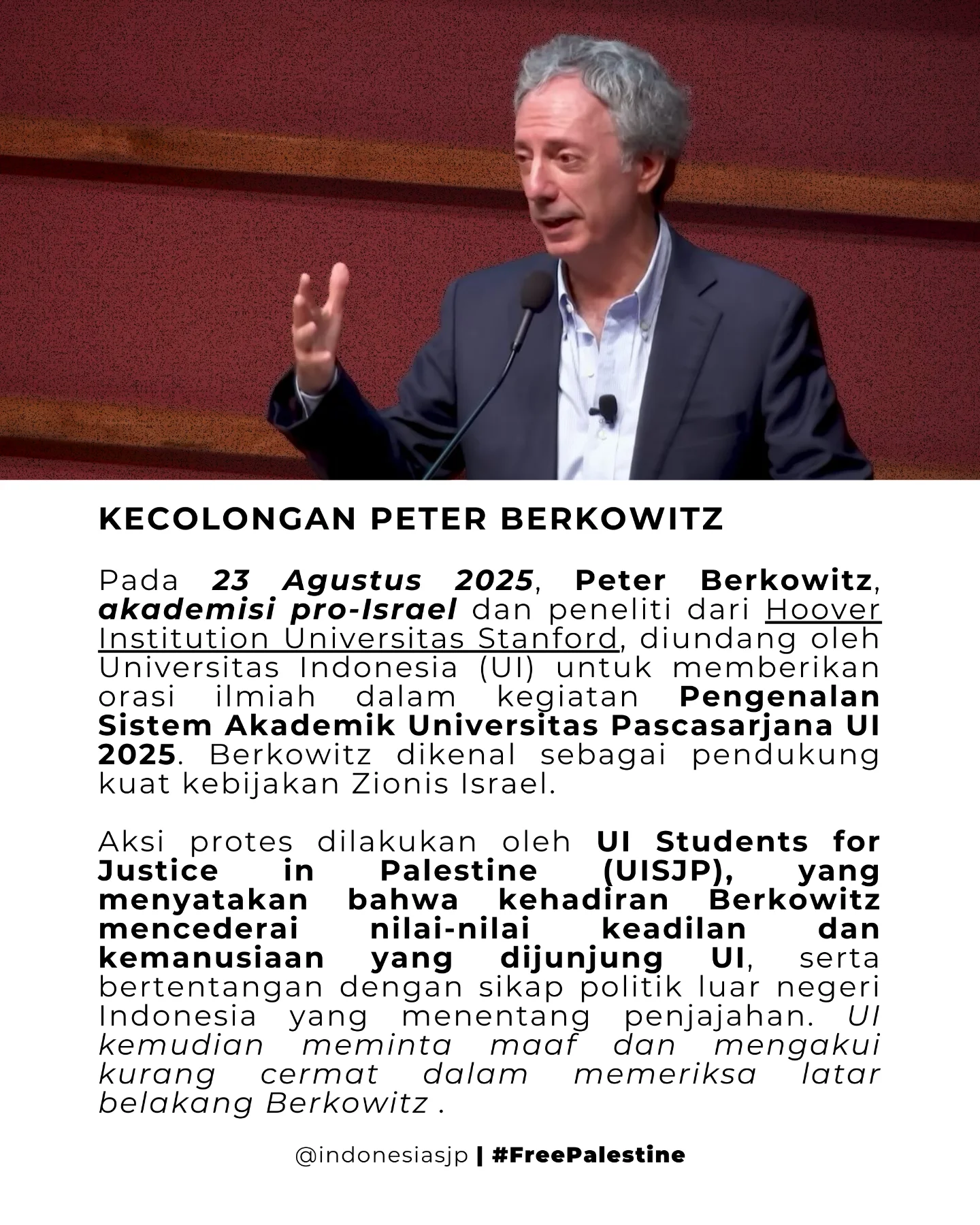 Dengan kembali mengundang Ricci, yang jelas mendukung kebijakan Israel di Palestina, UI menunjukkan ketidakseriusan dalam menanggapi tuntutan mahasiswa untuk menjaga nilai kemanusiaan dan keadilan. Kita harus terus melawan normalisasi Israel di kampus kita dan mendesak UI untuk berpihak pada kemerdekaan Palestina!