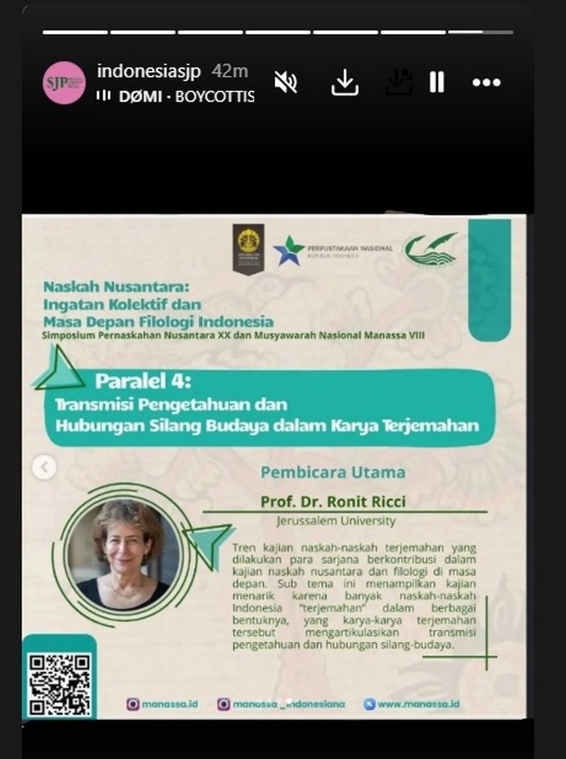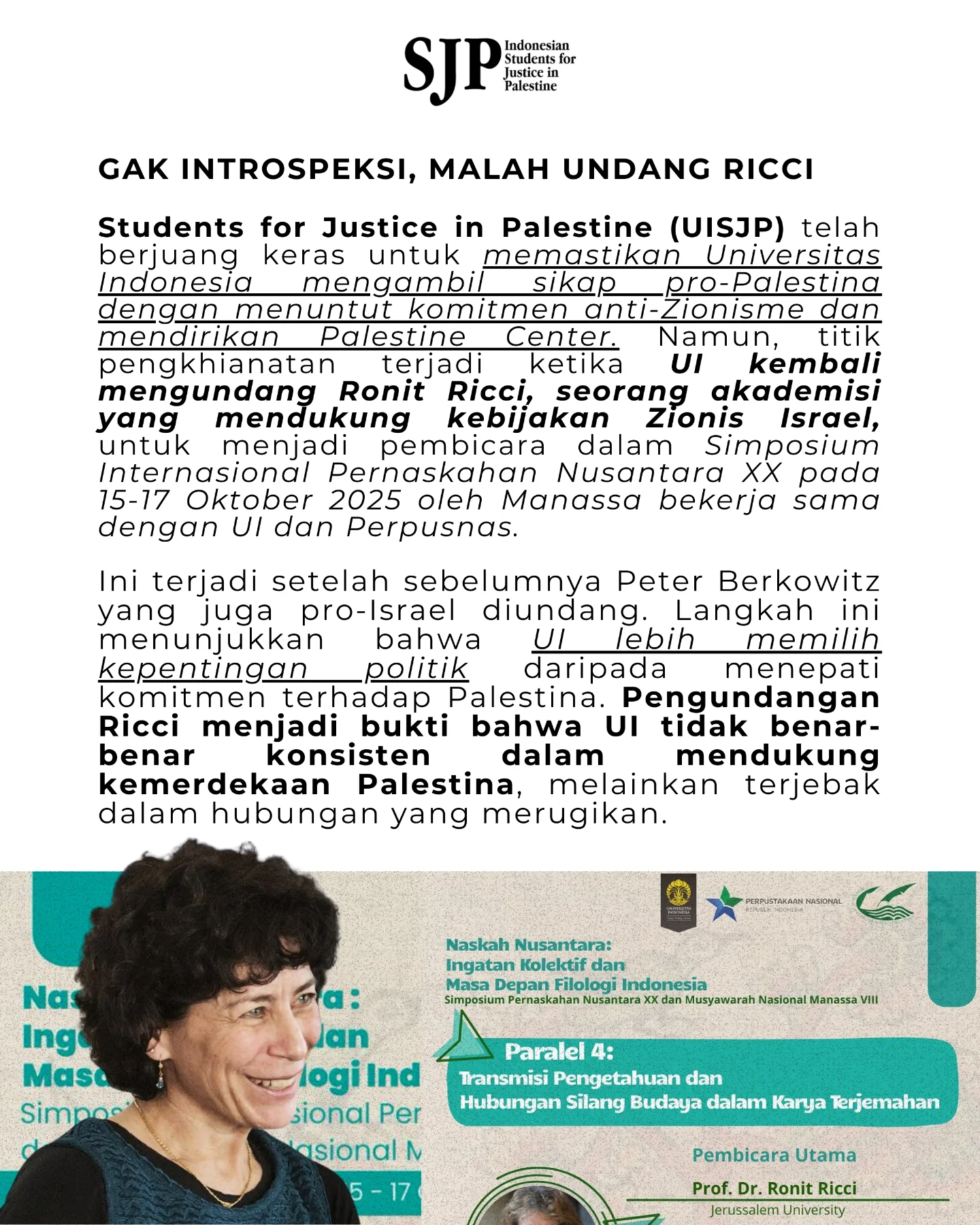 Setelah mengundang Peter Berkowitz, akademisi pro-Israel yang mendukung kebijakan apartheid Israel, kini Universitas Indonesia (UI) tanpa rasa malu kembali mengundang Sejarawan Israel, Ronit Ricci, sebagai pemateri di Simposium Internasional Pernaskahan Nusantara XX yang akan diselenggarakan pada 15-17 Oktober 2025.