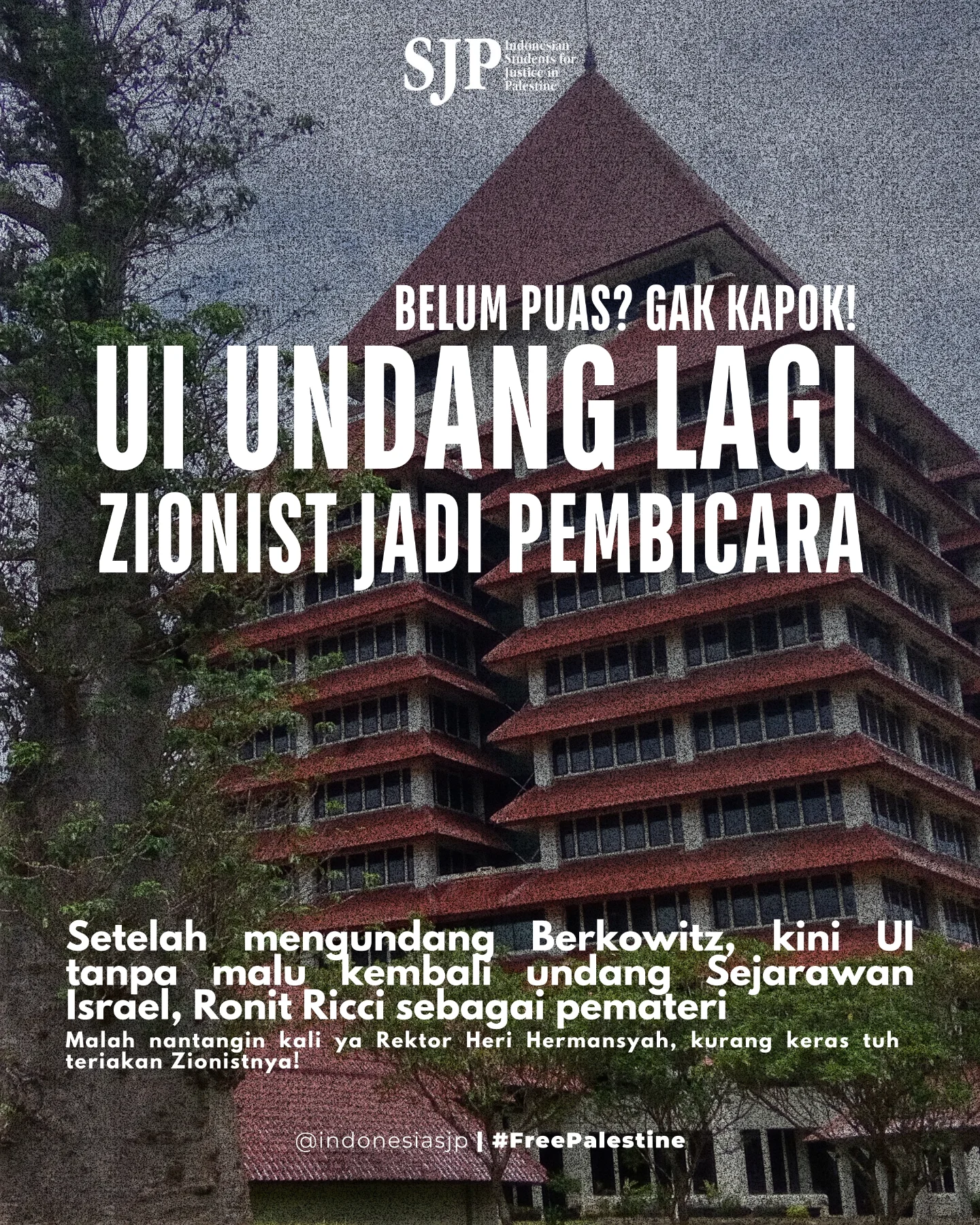 Dengan kembali mengundang Ricci, yang jelas mendukung kebijakan Israel di Palestina, UI menunjukkan ketidakseriusan dalam menanggapi tuntutan mahasiswa untuk menjaga nilai kemanusiaan dan keadilan. Kita harus terus melawan normalisasi Israel di kampus kita dan mendesak UI untuk berpihak pada kemerdekaan Palestina!