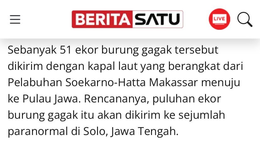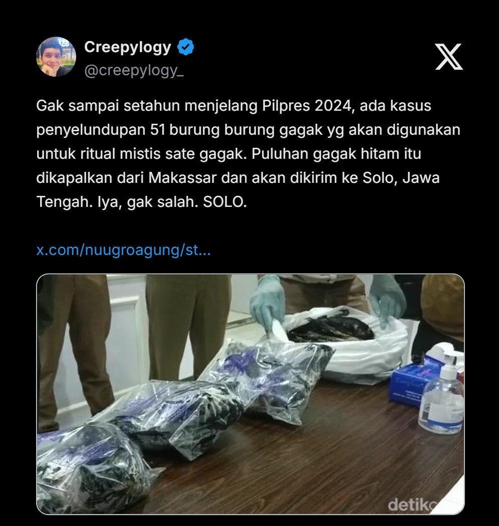 Gak sampai setahun menjelang Pilpres 2024, ada kasus penyelundupan 51 burung gagak yg akan digunakan untuk ritual mistis sate gagak. Puluhan gagak hitam itu dikapalkan dari Makassar dan akan dikirim ke Solo, Jawa Tengah. Iya, gak salah. SOLO.