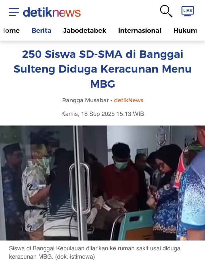 Lebih dari 250 siswa di Kabupaten Banggai Kepulauan, Sulawesi Tengah (Sulteng), diduga mengalami keracunan setelah menyantap Makan Bergizi Gratis (MBG). Mereka adalah siswa SD, SMP, hingga SMA di wilayah itu.