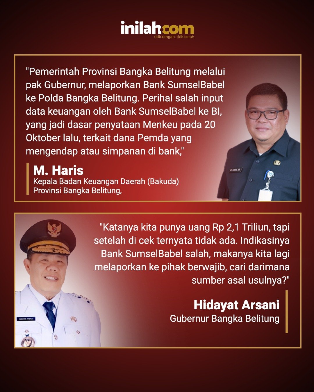 Pemprov Bangka Belitung kini melaporkan Bank SumselBabel ke Polda Babel, karena diduga salah input data keuangan ke sistem Bank Indonesia—yang kemudian menjadi dasar pernyataan Menkeu.