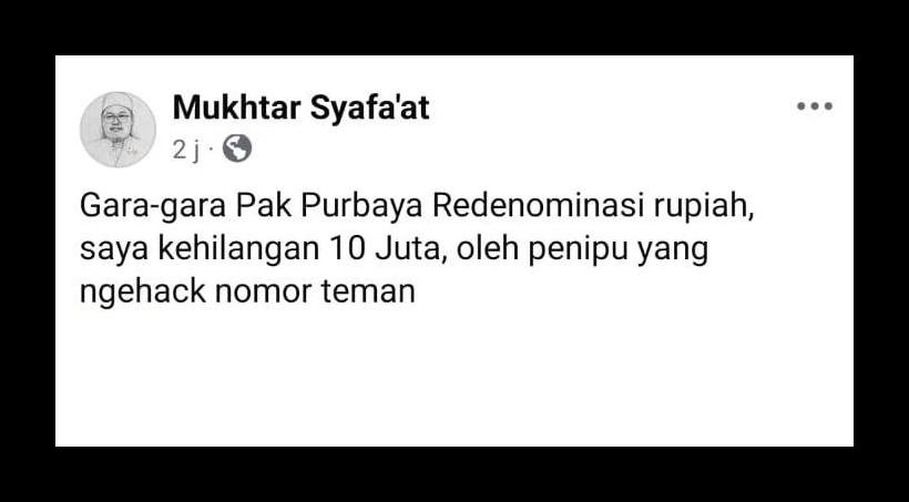 “Gara-gara Pak Purbaya Redenominasi rupiah, saya kehilangan 10 Juta, oleh penipu yang ngehack nomor teman 🤣🤣”