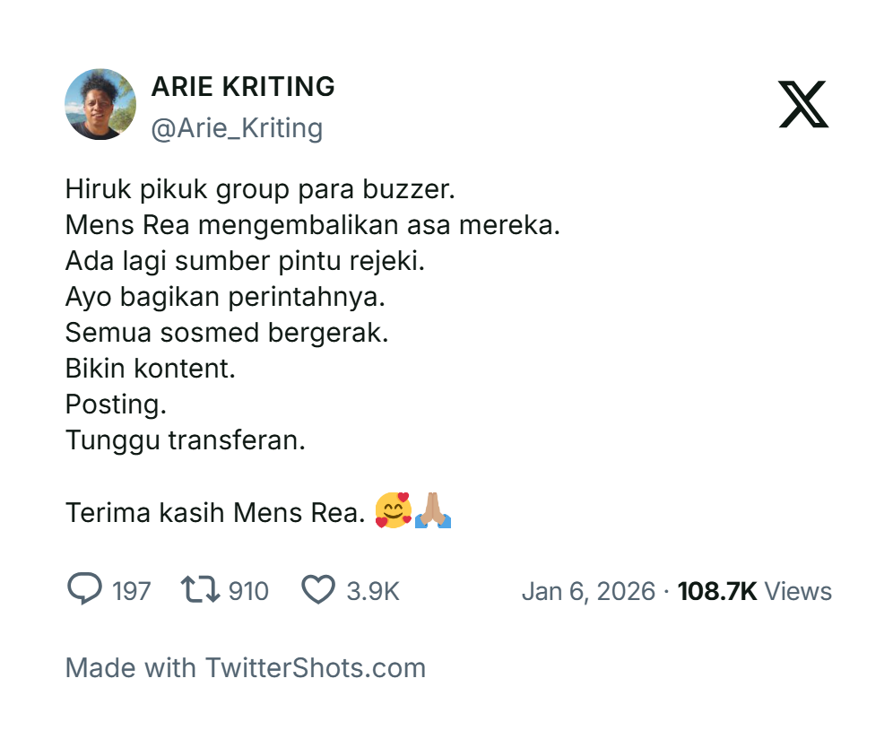 Terima kasih Mens Rea. 🥰🙏🏽,” sindir @Arie_Kriting di X.