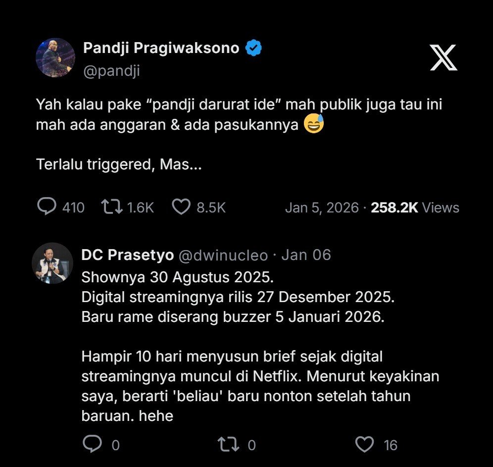 KOMEDI tunggal atau stand-up comedy spesial “Mens Rea” Pandji Pragiwaksono menjadi salah satu tontonan terpopuler di Netflix sejak tayang pada 26 Desember 2025.
