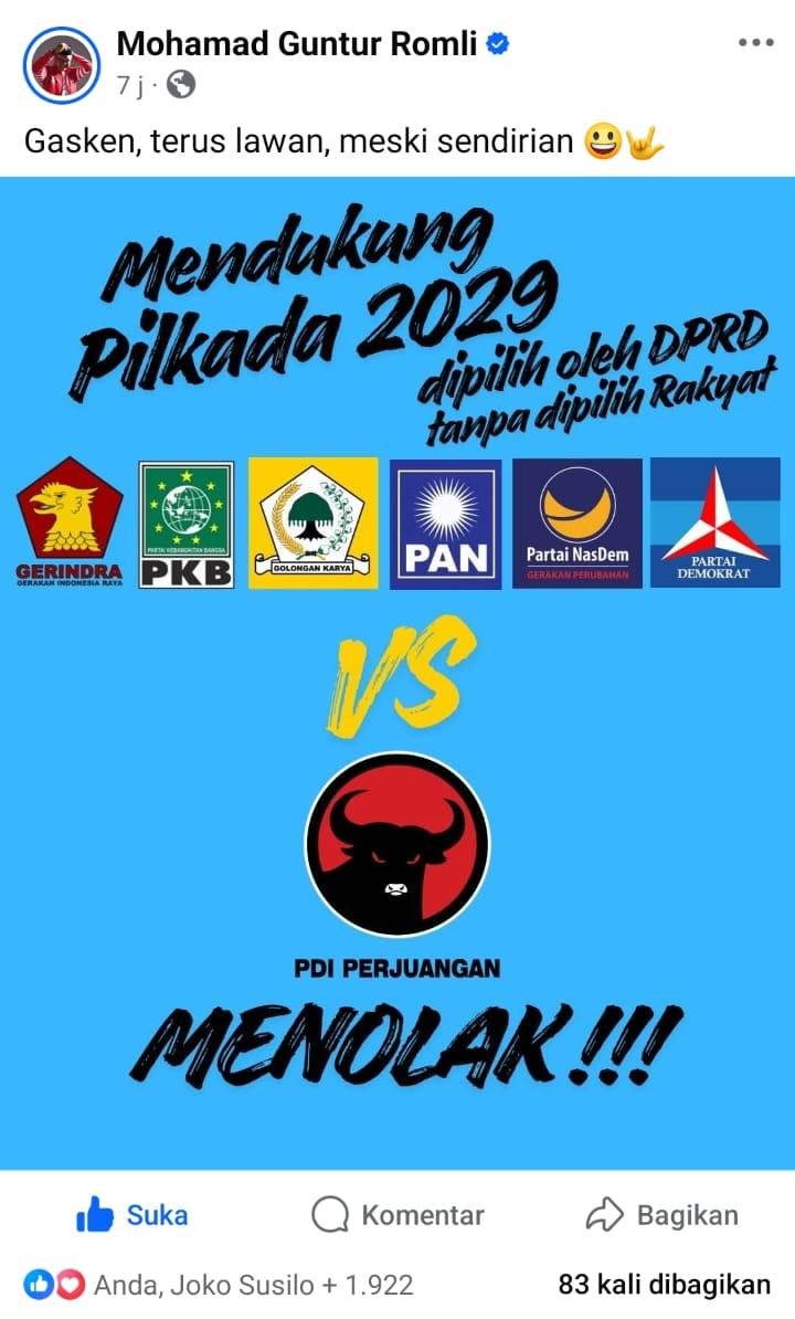 Postingan jubir PDIP Mohamad Guntur Romli di akun facebooknya.