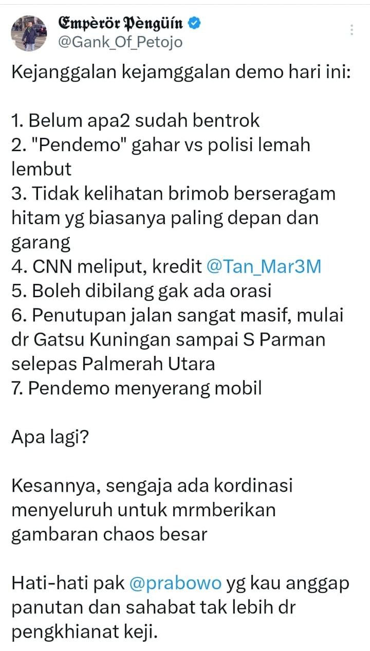 Akun X oposisi yang biasa mengorganisir demo oposisi yakni akun @barengwarga mencurigai “aparat” turut bermain “memanaskan” situasi agar chaos.